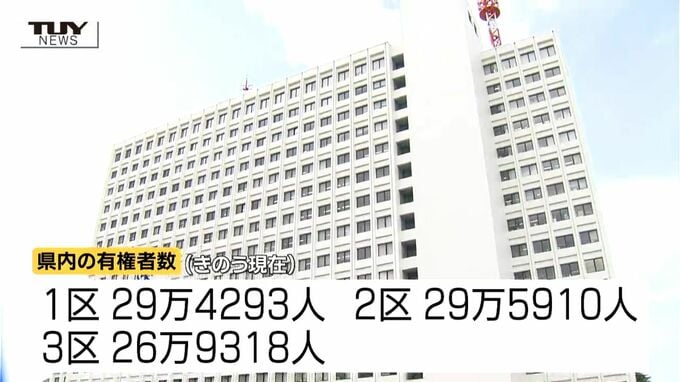 きのう現在の県内の有権者数は、1区が29万4293人、2区が29万5910人、3区が26万9318人です。衆院選の投票と開票は来月8日で、あすから期日前投票も始まります。