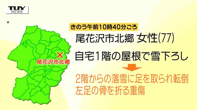 きのう午後1時10分ごろには、米沢市笹野で、自宅の屋根の雪下ろしをしていた85歳の男性が足を滑らせ、およそ2.6メートル下の地面に転落しました。