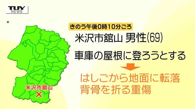 きのう午後0時10分ごろ、米沢市舘山の住宅で、69歳の男性が雪下ろしをしようと車庫の屋根に登ろうとした際、はしごからおよそ2.9メートル下の地面に転落しました。