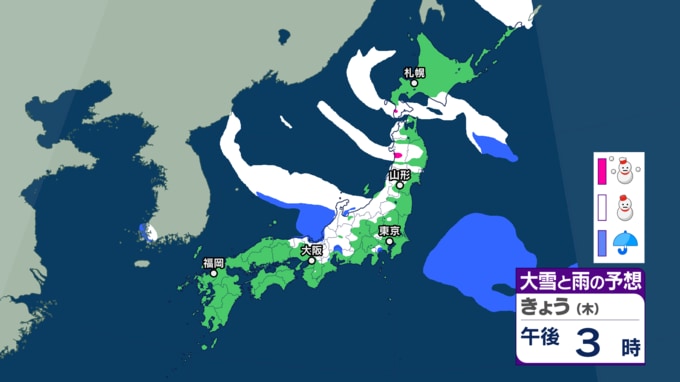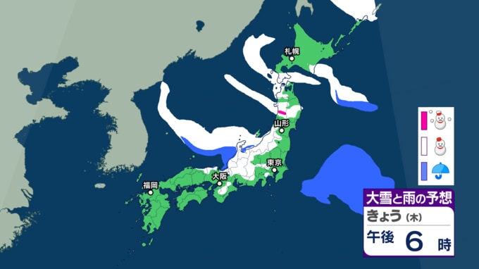 日本海側を中心に30日にかけて大雪の所も...【29日~30日の降雪シミュレーション】いつ・どこで雪降る? 東京23区でも雪の可能性 24時間予想降雪量は? 大雪情報 気象庁 2026年1月29日(木) 14:14 国内 ■雪と雨のシミュレーション(画像) 29日の雪と雨の予報