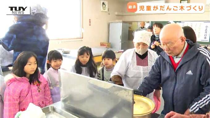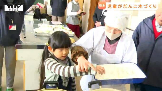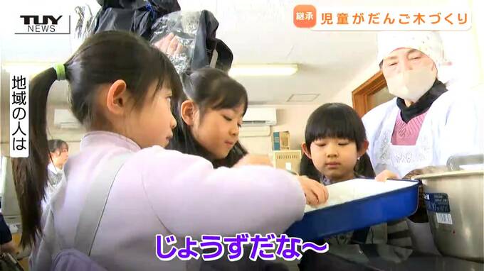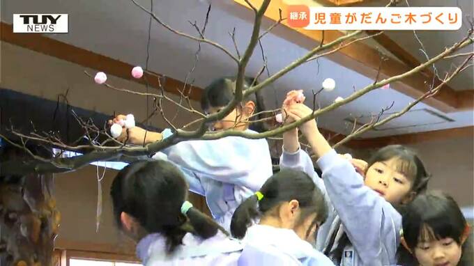大内希美アナウンサー「完成したお団子を手を伸ばして一生懸命さしていきます。どんなだんご木が完成するのでしょうか」