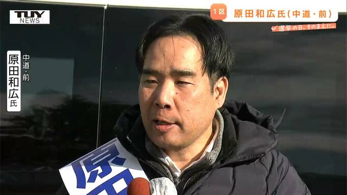 中道・前 原田和広氏「繰り上げ当選よりはここで勝って、小選挙区で勝って当選して本当に議員になったんだと自信を持ちたいという思いもあるので、そういう意味では逆に解散してくれてよかったかもしれないと思うようにしています。山形県全域のみなさんの暮らしを私は変えるという気持ちでこの選挙に臨んでいます」