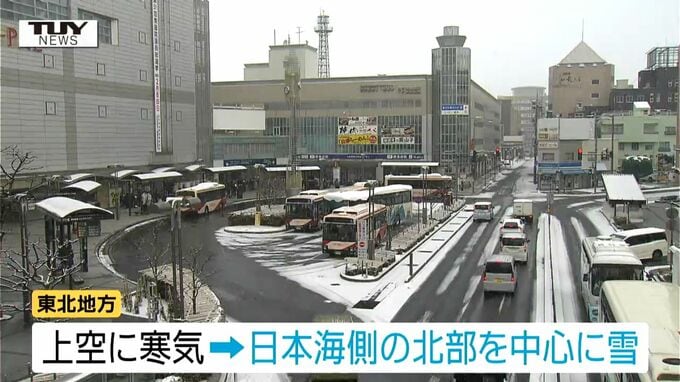 気象台によりますと、東北地方の上空に寒気が流れ込んでいる影響で、日本海側の北部を中心に雪が降っていて、県内でも雪や吹雪のところが多くなっています。