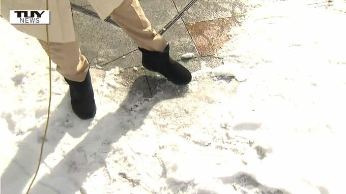 佐藤真優アナウンサー「午前10時前のJR山形駅前です。あたたかい日が差してきました。足元を見てみると、表面の白い雪が溶け、その下で氷上になっていて非常に滑りやすくなっています」