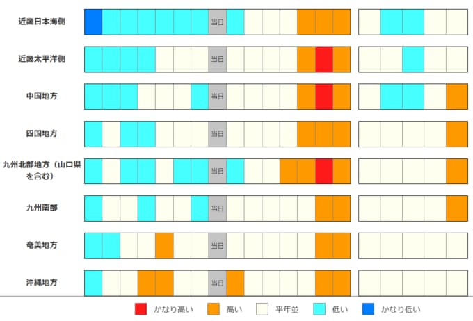 四国地方、九州南部と沖縄・奄美の向こう2週間の気温は、平年並か高いでしょう。