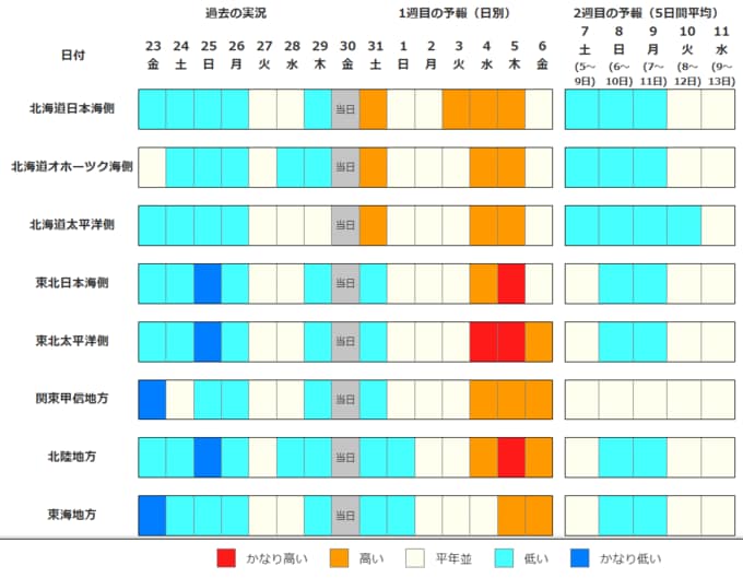 北海道地方の気温は、向こう1週間程度は平年並か高いですが、その後は平年並か低いでしょう。
