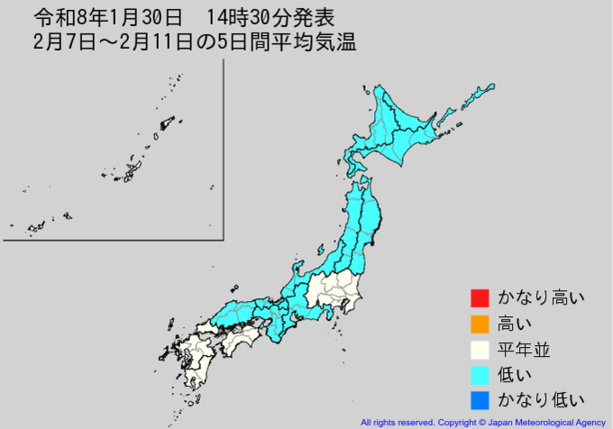 【2週間気温予報】東北地方、東日本、近畿地方、中国地方と九州北部地方の気温は向こう3日間程度は平年並か低い予報 その後2月6日頃までは高くかなり高い所も 全国の天気を地方ごとに 気象庁 2026年1月30日(金) 15:38 国内 ■2月7日~2月11日の5日間平均気温(画像) ・8日先から12日先まで5日間平均した日平均気温を表示しています。 ・かなり高い(かなり低い)は、かなり高い(かなり低い)気温となる確率が30%以上のときに表示します。