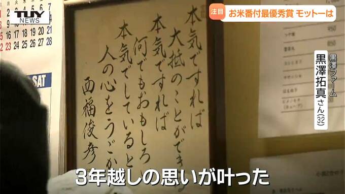 黒澤ファーム 黒澤拓真さん(32)「1年頑張ったからおいしいものができるわけではない。でもお米は一年に1回しか作れない。1年に1回のものをやり続けるってすごく大変。3年間ずっと日本一取りたいという思いで作ってきたので3年越しの思いが叶った」