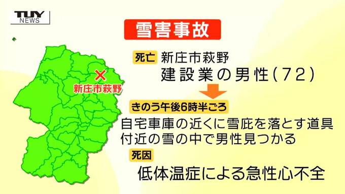 死亡したのは、新庄市萩野に住む建設業の男性(72)です。警察によりますと、男性はきのう夕方頃から姿が見当たらなくなり、家族や近隣住民が探していたところ、午後6時半ごろ、自宅の車庫の近くで雪庇を落とす道具を見つけ、付近の雪を掘り進めたところ、意識のない状態の男性を見つけたということです。男性はその後、病院で死亡が確認されました。死因は低体温症による、急性心不全でした。