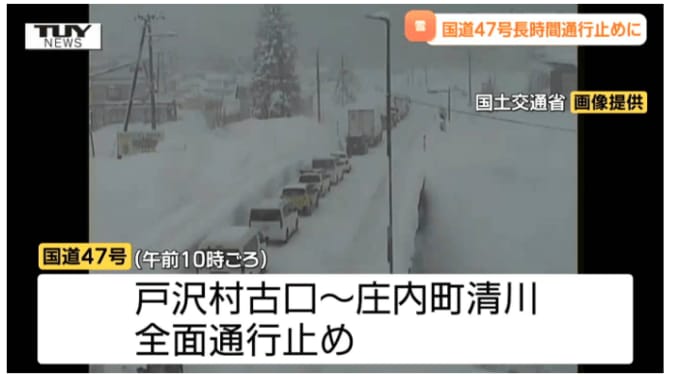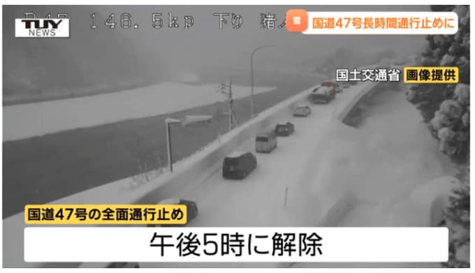 国道47号は、車の移動や除雪作業のため戸沢村古口から庄内町清川の間で午前10時頃から全面通行止めとなり、正午ごろには新庄市升形から庄内町清川の間に規制が延長されました。