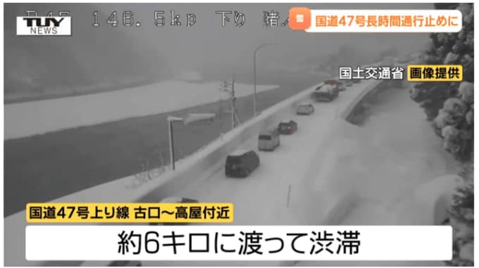 これにより国道47号上り線は、古口から高屋付近までのおよそ6キロに渡って渋滞が発生しました。