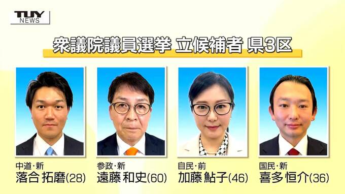 県3区には中道改革連合の新人、落合拓磨さん(28)、参政党の新人、遠藤和史さん(60)、自民党の前職、加藤鮎子さん(46)、国民民主党の新人、喜多恒介さん(36)の4人が立候補しています。
