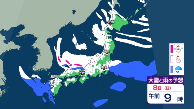 気象庁は5日に発表した週間天気予報解説資料で「8⽇は、強い寒気の影響で北⽇本から⻄⽇本にかけての⽇本海側を中⼼に⼤雪となり、寒気の程度によっては警報級の⼤雪となる可能性がある」としています。