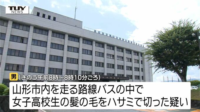 警察によりますと、男はきのう午前8時ごろから8時10分ごろまでの間に、山形市内を走る路線バスの中で女子高校生の髪の毛をハサミで切った疑いが持たれています。