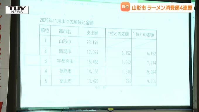 山形市の去年1年間の一世帯あたりの中華そばの消費額は2万5102円で、過去最高となった去年の消費額をさらに更新する快挙となりました。