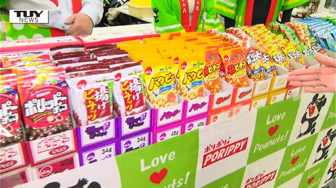 佐藤友美アナウンサー「見てください。チョコやピーナッツ、そして定番の商品など甘いからしょっぱい、いろんな商品が並んでいます」