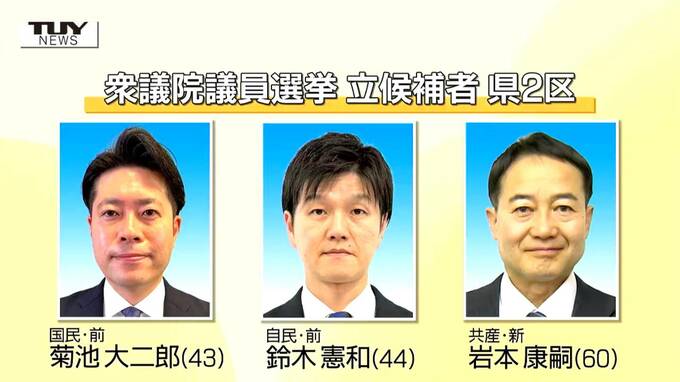 【山形1区、2区】衆議院選挙 迫る投開票 各候補のこれまでの選挙戦を振り返る 2026年2月6日(金) 19:20 国内 ■県2区 県2区に立候補したのは、国民民主党の前職、菊池大二郎さん(43)、自民党の前職、鈴木憲和さん(44)、共産党の新人、岩本康嗣さん(60)の3人です。