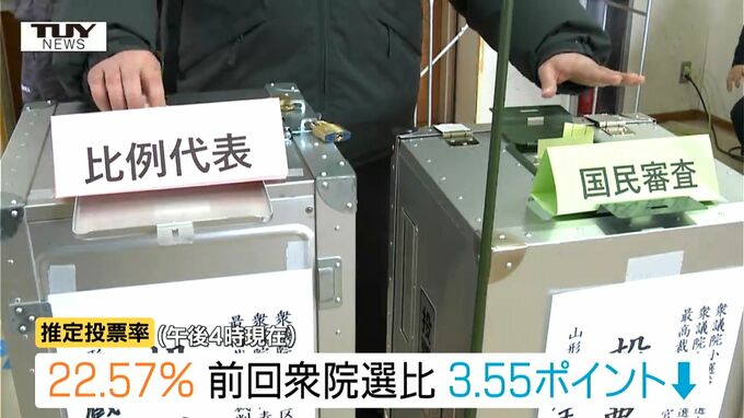 県選挙管理委員会によりますと、午後4時現在の推定投票率は、22・57%で、おととしの前回の衆院選に比べ3・55ポイント下回っています。