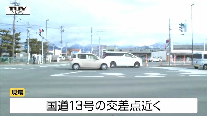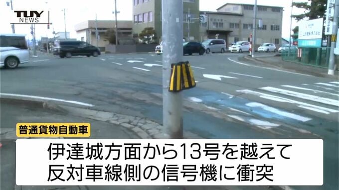 現場は、国道13号の交差点近くで、車は伊達城方面から国道13号を渡り反対車線側の信号機に衝突しました。