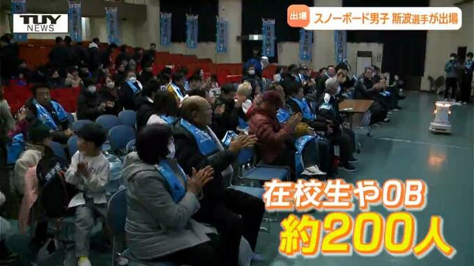 平昌オリンピック以来2回目のオリンピックの滑走を応援しようと、母校・山形南高校では在校生やOBらおよそ200人が集まりイタリアへエールを送りました。