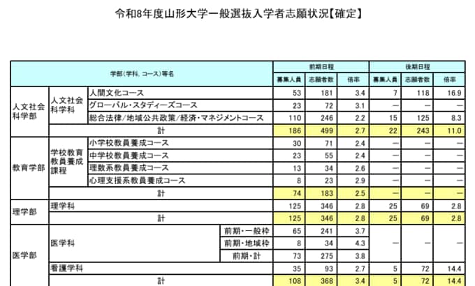 山形大学 令和8年度一般入試の志願倍率発表 前期は2.3倍、後期6.9倍に 学部ごとの詳細な倍率・今後の日程も掲載 2026年2月9日(月) 18:56 国内 ■画像(山形大学 志願者数・倍率 公表資料)