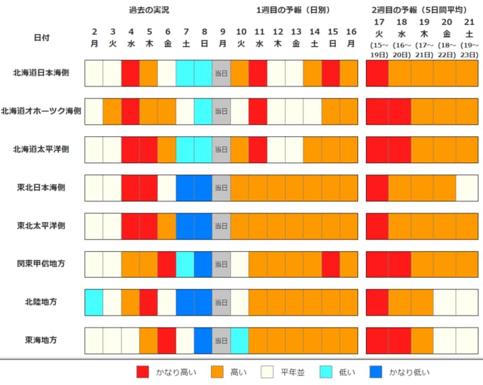 全国的に向こう2週間の気温は、寒気の影響が弱いため高い日が多く、北・東・西日本と奄美地方では15日頃からはかなり高い日もあるでしょう。農作物の管理等に注意してください。