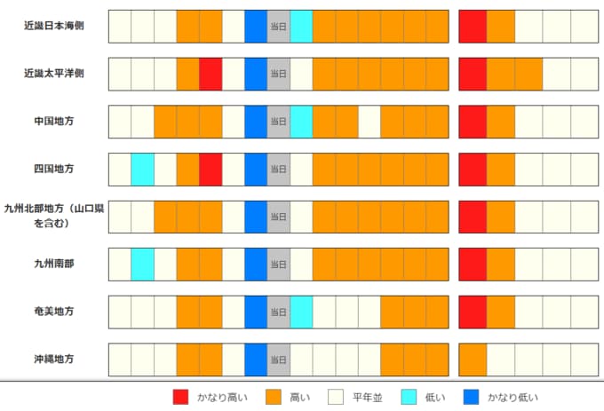 ・2週目の予報は中心の日に前後2日間を加えた5日間の平均(平均気温の5日間平均)です。平均期間は中心の日の下に表示しています。2週目のかなり高い(かなり低い)は、かなり高い(かなり低い)気温となる確率が30%以上のときに表示します。