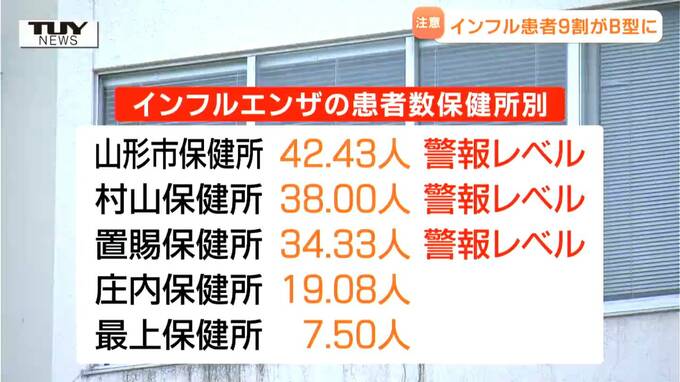 保健所別では、山形市保健所で42.43人、村山保健所で38.00人、置賜保健所で34.33人、庄内保健所で19.08人、最上保健所で7.50人となっていて、保健所別では、山形市・村山・置賜で警報レベルとなりました。