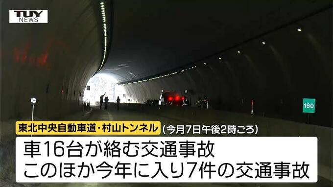 村山市の東北中央自動車道・村山トンネルでは今月7日午後2時ごろに車16台が絡む事故が発生しました。