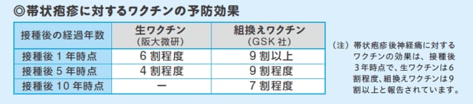 まず「効果の持続性」についてです。「生ワクチン」は接種後1年時点で6割程度の効果がありますが、5年後には4割程度に低下します。一方、「組換えワクチン」は効果が高く、接種後1年時点で9割以上、10年が経過しても7割程度の効果を維持するとされています。