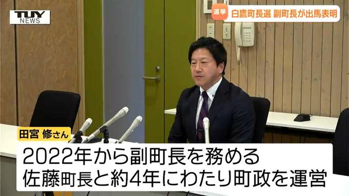 きょうは副町長の田宮修さんが出馬の方針を固め会見を開きました。