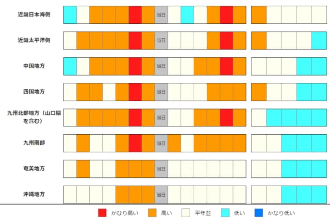 ・2週目の予報は中心の日に前後2日間を加えた5日間の平均(平均気温の5日間平均)です。平均期間は中心の日の下に表示しています。2週目のかなり高い(かなり低い)は、かなり高い(かなり低い)気温となる確率が30%以上のときに表示します。
