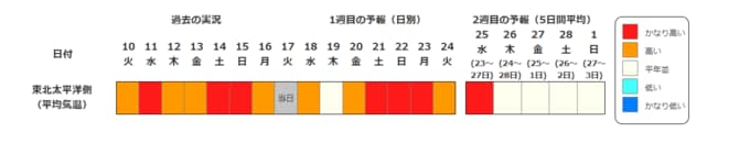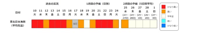 東北地方の向こう2週間の気温は、寒気の影響を受けにくく暖かい空気が流れ込みやすい時期があるため平年並か高い日が多く、22日頃からはかなり高くなる見込みです。農作物の管理等に注意してください。積雪の多い地域ではなだれに注意し