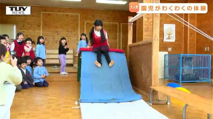 月かげ幼稚園では、SASUKEに憧れた園児の一言をきっかけに手作りのコースを作り、サスケごっこが大人気です。きょうは、園児およそ40人が多田さんと一緒に楽しく体を動かしました。