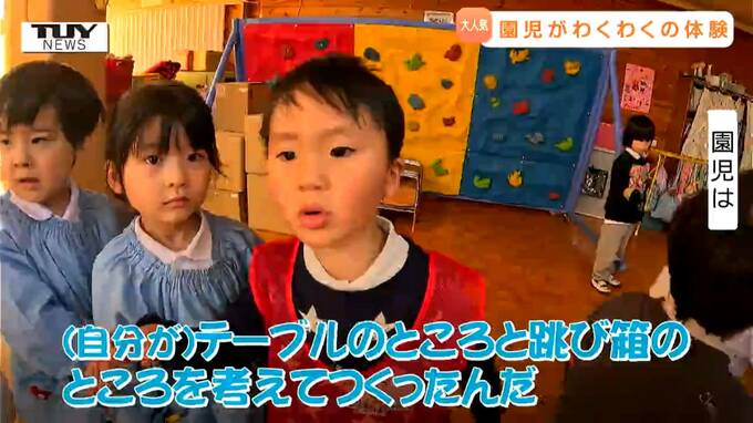 園児は「(自分は)テーブルのところと、跳び箱のところを考えて作ったんだけれど、他のところはつくってない」