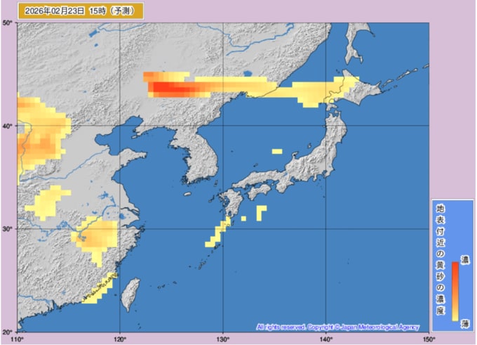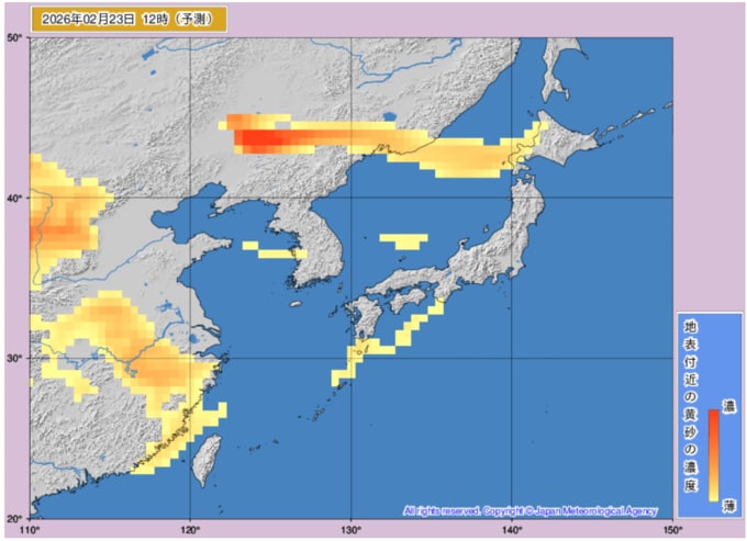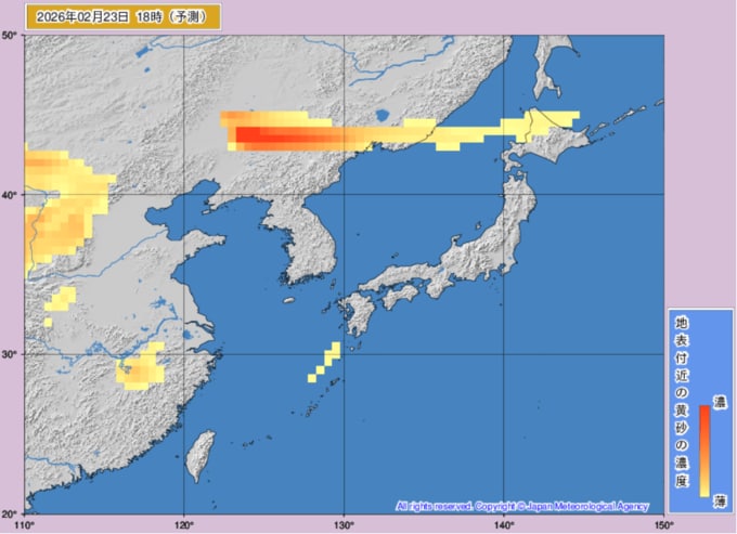 【黄砂情報】23日、24日は日本に黄砂飛来か...2月23日~2月24日の黄砂シミュレーション いつどこに、どれくらい飛んでくる? 黄砂を上空から見たデータで確認 気象庁発表 2026年2月23日(月) 11:06 国内 ■黄砂はいつ・どこに飛んでくる?(23日)