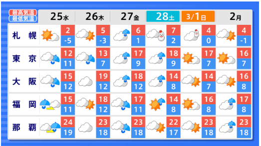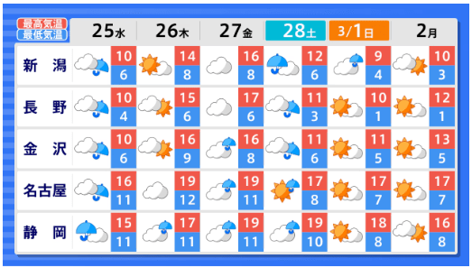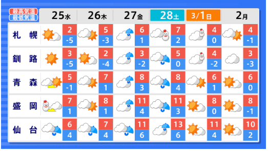 降雪量は平年並か少ないか...東北地方の向こう1か月(2/21~3/20)の天候の見通しは? 平均気温・降水量・日照時間・降雪量は? 全国の天気を画像で 気象庁 2026年2月23日(月) 19:55 国内 ■全国の天気を地方ごとに(画像) 画像はTBS NEWS DIG Powered by JNNより 画像ありの記事を最初から https://newsdig.tbs.co.jp/articles/-/2485594?display=1