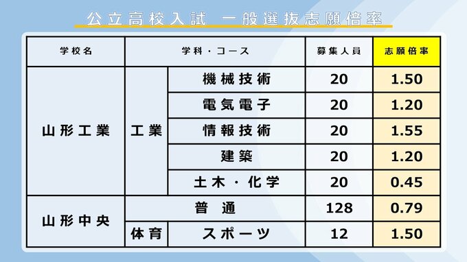【全高校掲載】2026年度山形県公立高校入試 志願倍率 令和8年度後期(一般)選抜入試 村山・置賜・庄内・最上地方の公立高等学校 2026年2月24日(火) 17:40 国内 ■村山地方の高校は 山形東探究科は、全体で1番目に高い2.22倍、山形南理数科は全体で3番目に高い1.69倍などとなっています。