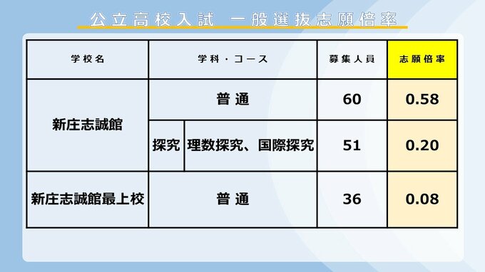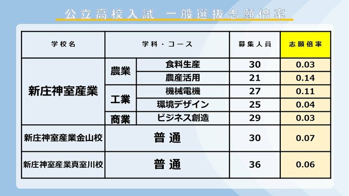 【全高校掲載】2026年度山形県公立高校入試 志願倍率 令和8年度後期(一般)選抜入試 村山・置賜・庄内・最上地方の公立高等学校 2026年2月24日(火) 17:40 国内 ■最上地方の高校は 新庄志誠館普通科は0.58倍、探求科も0.20倍と定員割れです。