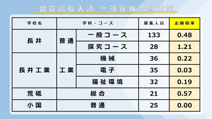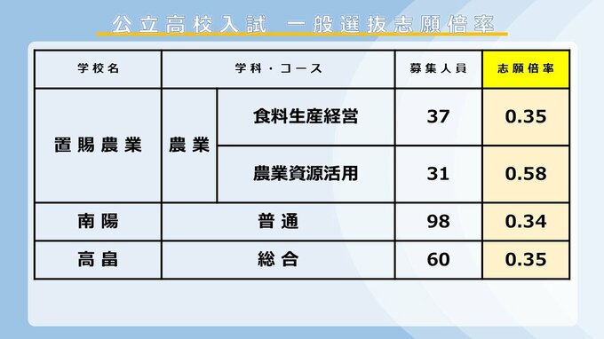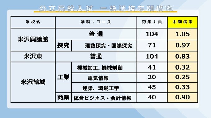 【全高校掲載】2026年度山形県公立高校入試 志願倍率 令和8年度後期(一般)選抜入試 村山・置賜・庄内・最上地方の公立高等学校 2026年2月24日(火) 17:40 国内 ■置賜地方の高校は 米沢興譲館普通科は1.05倍、探求科は0.97倍。米沢東普通科は定員割れ、米沢鶴城も全ての学科で定員割れです。
