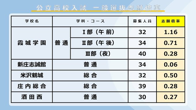 【全高校掲載】2026年度山形県公立高校入試 志願倍率 令和8年度後期(一般)選抜入試 村山・置賜・庄内・最上地方の公立高等学校 2026年2月24日(火) 17:40 国内 ■定時制公立高校は 定時制の高校は、霞城学園のⅠ部が1.16倍などとなっています。
