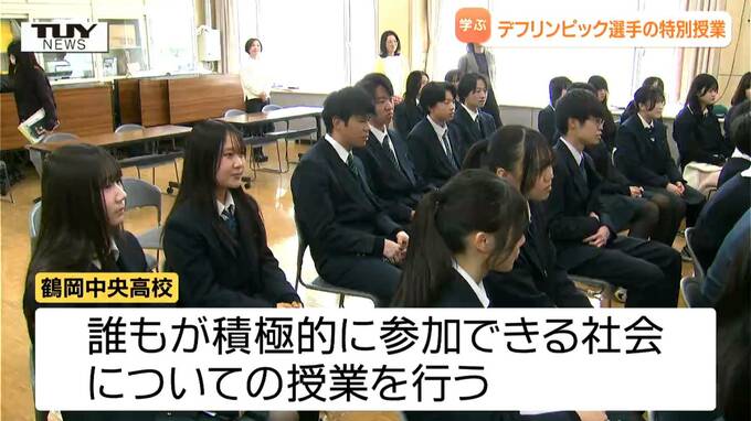福祉について学ぶ高校生が、耳が聞こえない人たちのための国際スポーツ大会、「デフリンピック」で活躍した選手とのコミュニケーションを通して、誰もが生活しやすい共生社会について理解を深める特別授業がきょう、鶴岡市で行われました。