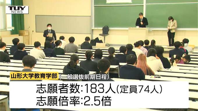 一般選抜前期日程で山形大学教育学部には74人の募集に対し183人が志願していて、志願倍率は2.5倍となっています。また、全学部の倍率は前期・後期合わせて2.8倍となり、去年の3.5倍を下回りました。