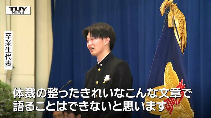 卒業生代表「新たな一歩へと私たちを招くこのよき日に山形南高校を卒業します…丁寧に答辞の文章を考えて参りました。体裁の整ったきれいなこんな文章で語ることはできないと思います。」