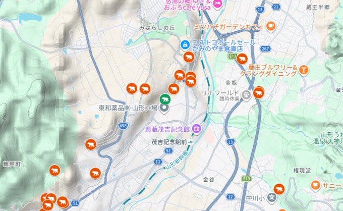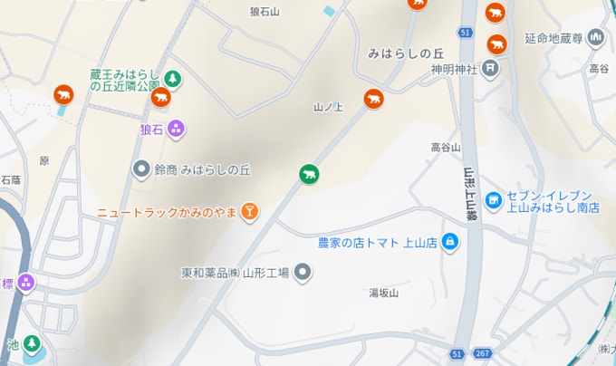 上山市にクマ みはらしの丘の製薬工場、ニュートラックかみのやま近くの路上で目撃 市が注意呼びかけ