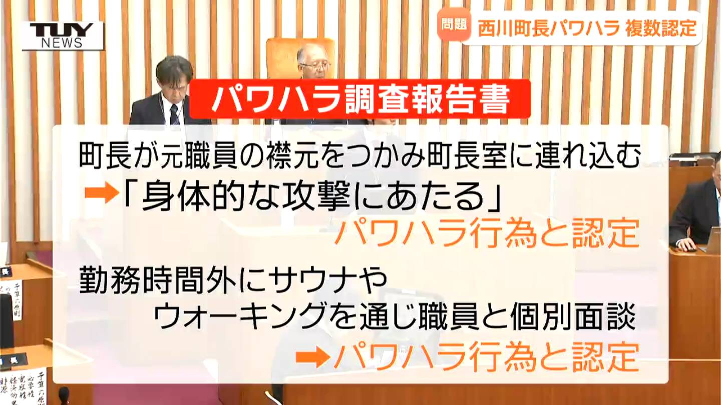 先月27日に開かれた臨時議会で提出された調査報告書によりますと、町長が元職員の襟元をつかんで町長室に連れ込んだ行為は、「身体的な攻撃にあたる」などとしてパワハラ行為であると認定したほか、勤務時間外にサウナやウォーキングを通じて職員と個別面談を行うといった行為もパワハラにあたると認めました。