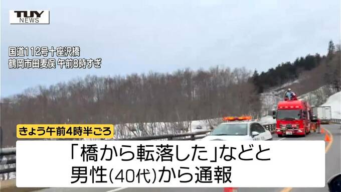 警察によりますと、きょう午前4時半ごろ、鶴岡市田麦俣の国道112号十座沢橋(じゅうざざわばし)で「橋から転落した」などと40代の男性から警察に通報がありました。