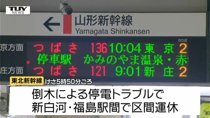 山形新幹線 東京・福島間の上下線で一時区間運休 停電の影響 午前9時過ぎに運転再開 2026年3月4日(水) 12:08 国内 停電の影響による東北新幹線の区間運休に伴い、山形新幹線でも、けさ、東京・福島間の上下線で運転見合わせが発生しましたが、午前9時過ぎに運転を再開しています。JR東日本によりますと、けさ5時50分ごろ倒…