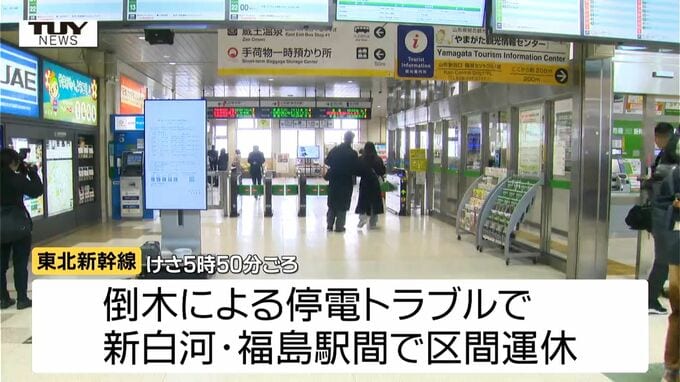 JR東日本によりますと、けさ5時50分ごろ倒木による停電トラブルで東北新幹線の新白河・福島駅間で区間運休が発生しました。