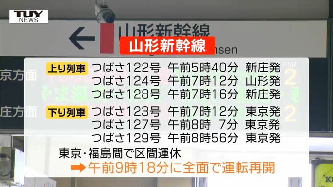 この影響で、山形新幹線の上り列車、午前5時40分新庄発のつばさ122号、午前7時12分山形発のつばさ124号、午前7時16分新庄発のつばさ128号の3本に、下り列車は午前7時12分東京発のつばさ123号、午前8時7分東京発のつばさ127号、午前8時56分東京発のつばさ129号の3本について、東京・福島間で区間運休が発生しました。